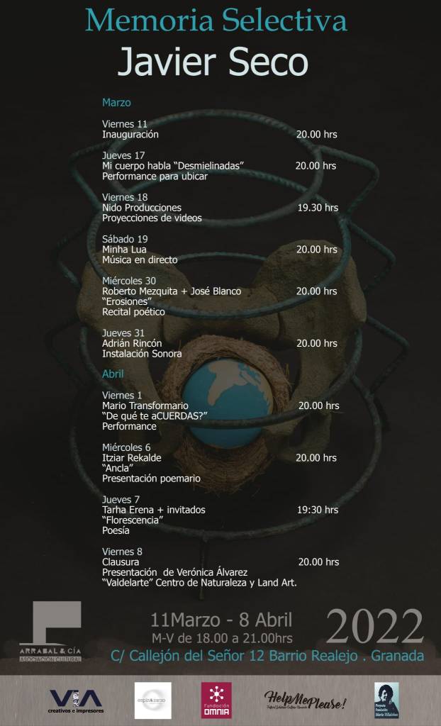 La cultura como punto de encuentro. En estos momentos de incertidumbre inaugurar una exposición es casi un acto de resistencia. Por ello la iniciativa de Seco de reunir diferentes actividades paralelas que convivan y se desarrollen durante un mes en la Galería Arrabal y Cía, habla de sinergias, de colaboración, de encuentros, de aunar energías. Habrá proyecciones de audiovisuales, paisajes sonoros, música en directo, presentaciones de libros y poesía, performances,…a cargo de renombrados artistas residentes en Granada que aportan, con enorme generosidad, su buen hacer a este evento. Así se plantea la exposición MEMORIA SELECTIVA Javier Seco en el espacio de la Galería Arrabal y Cía. Como una caminata por su estancia en la ciudad de Granada jalonada de objetos encontrados, pinturas, esculturas o instalaciones que propician un paseo en conversación con los recuerdos escogidos por el autor.
